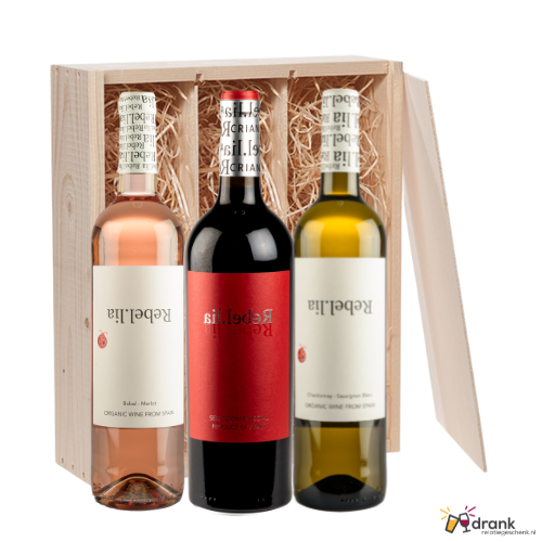 Drankrelatiegeschenk met Rebel.lia Inhoud verpakking 1x Rebel.lia Rosado 1x Rebel.lia Bobal Crianza 1x Rebel.lia Blanco...